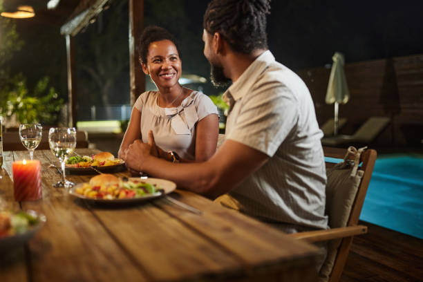 Happy African American couple communicating during late dinner on a patio by the swimming pool.